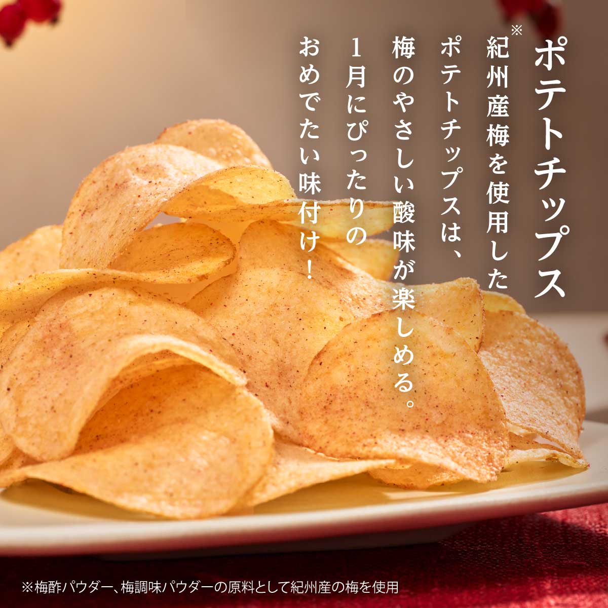 湖池屋揚げたて直送便から、冬の季節限定品が登場!年が開けた1月、「だし香る梅」味のポテトチップスに、別添の「ばら海苔」を振りかけてお楽しみください。