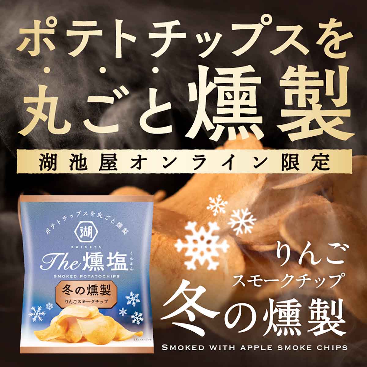 冬限定の味わい「KOIKEYA The 燻塩 冬の燻製」は、燻製材として「りんご」のスモークチップを使用。