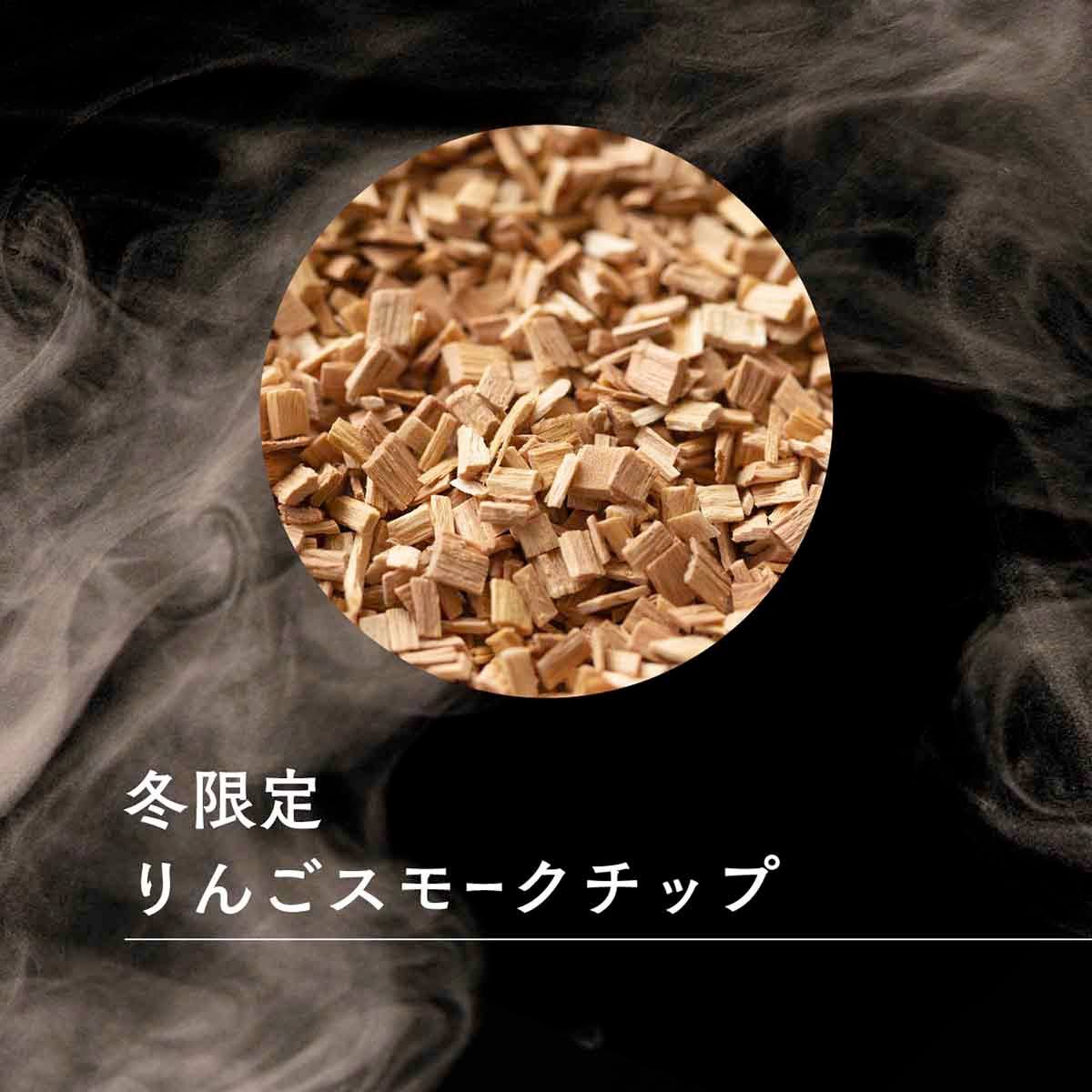燻製材として「りんご」のスモークチップを使用。香りが甘く、柔らかい風味を持っており、ほのかな酸味と上品な味わいが特徴です。
