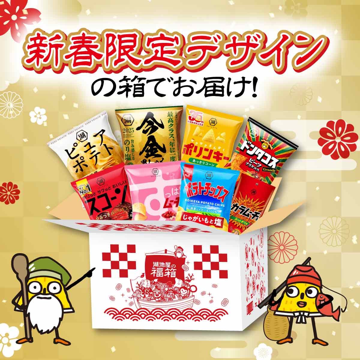 福を連れてくる!七福神の湖池屋キャラクターが載ったお正月限定BOXでお届けします!