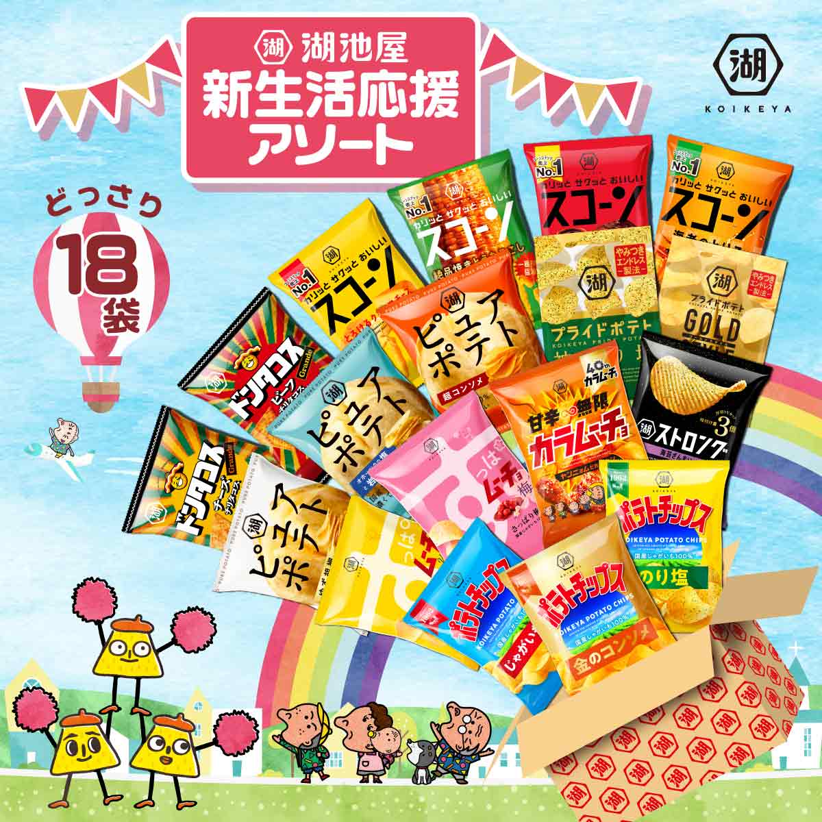 • 湖池屋のポテトチップスやスナックをたっぷり詰め込んだ、当店オリジナルのアソートをご用意しました。