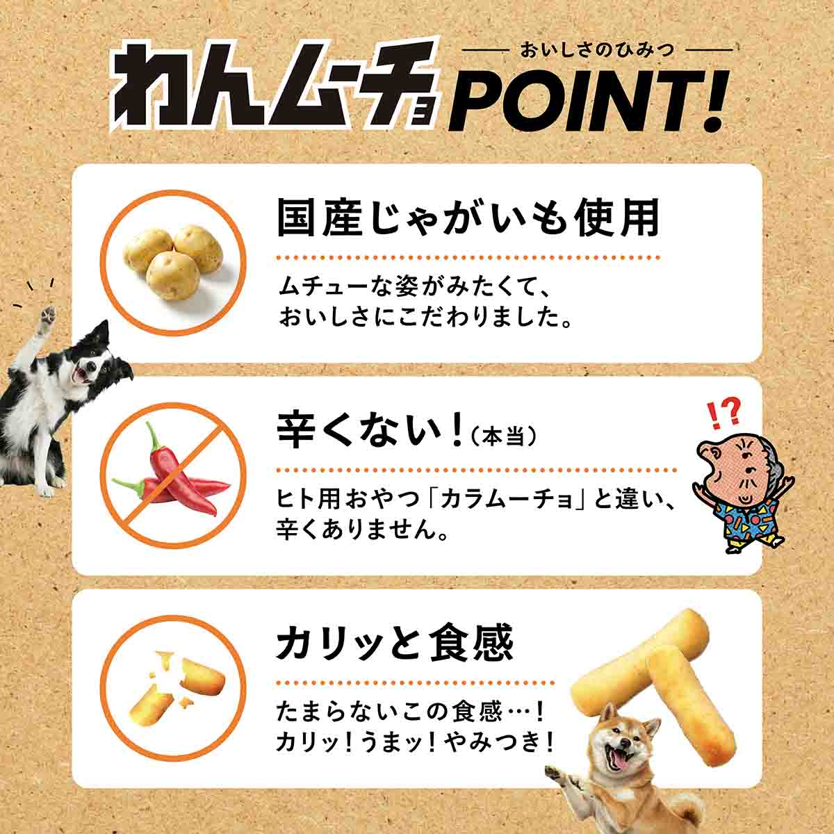 犬用おやつ「わんムーチョ」は、「カラムーチョ」と違い、辛くありません。